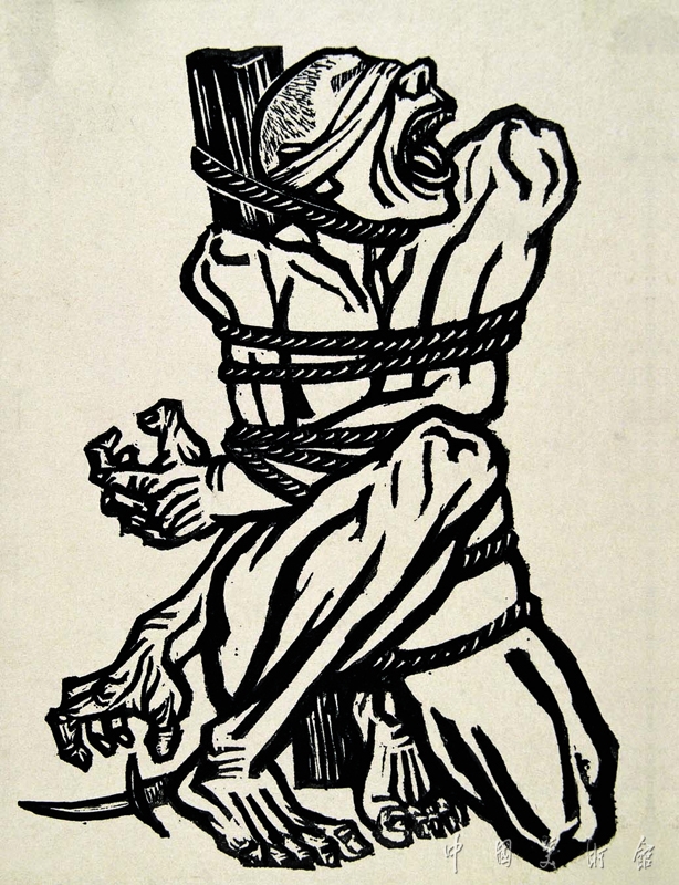 《怒吼吧,中國》作于30年代全民族反帝救亡熱潮中。這件作品采用象征手法,以一個被緊緊捆綁、雙眼被蒙蔽的痛苦而屈辱的男人軀體,預示一個民族終要起而怒吼和抗爭的忍無可忍的選擇。從這件作品中,不僅可以看到作者結實明快的畫風和苦心經(jīng)營的處理,也可以看出他在木刻民族化上的努力。作品有強烈的視覺沖擊力,是30年代新興木刻的力作之一。